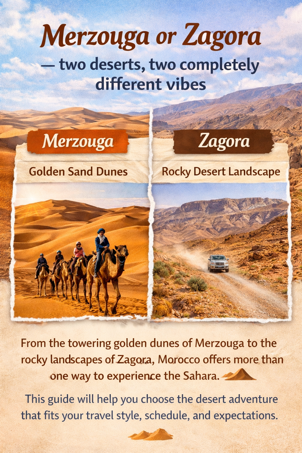 The Sahara Desert is one of Morocco’s most awe-inspiring natural wonders, and exploring it is a bucket-list experience for many travelers. Two of the most popular desert destinations are Merzouga and Zagora, each offering a unique taste of the Sahara. In this guide, we’ll compare Merzouga and Zagora to help you choose the perfect desert tour for your adventure.Merzouga vs Zagora tours